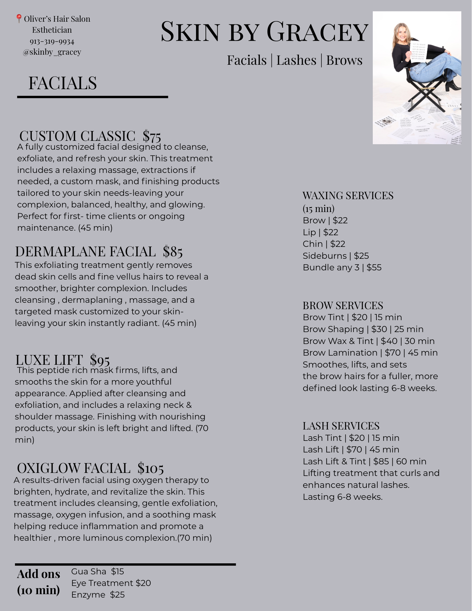 Hi, I’m Gracey! I’m a licensed esthetician with nearly three years of experience specializing in results-driven, customized skincare treatments. I’m passionate about helping clients feel confident and cared for in a comfortable, welcoming space. I offer facials, brow and lash services, and facial waxing. I’m always expanding my knowledge to bring the best care to my clients. I love what I do and I can’t wait to meet some new faces!